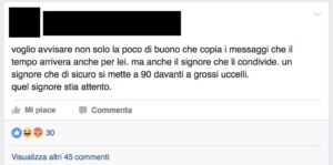 Pare chiaro che la signora abbia ottenuto dei ragguagli giuridici da Ally McBeal o dalla sua sensitiva. Non le è chiaro, evidentemente, come funzioni Facebook e la privacy. Tant’è che in un post un po’ più in basso, sempre in quel gruppo, c’è addirittura il suo indirizzo di casa, inserito per una raccolta “coperte per i pelosi del canile”. Ero tentato di inviarle una busta anonima con dentro un Pan di Stelle, visti i precedenti con la signora Mariella. Ma mi sono dovuto bloccare a seguito di questo turpe avvertimento di suo marito.