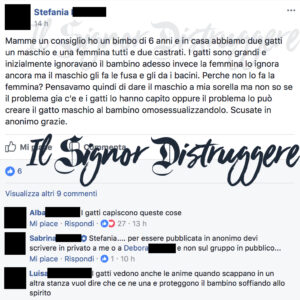 Oggi ho riaperto per qualche ora la posta della pagina Facebook, per recuperare alcuni vecchi contatti, e durante questa parentesi noiosa mi arriva un messaggio della nostra Stefania. La signora che sul gruppo segreto “Pancine, Cuori & Bimbi“, dell’ormai celebre Sabrina, nel tentativo fallito di chiedere un consiglio in anonimo, ci ha regalato la perla del gatto omosessualizzante. È seguita, dunque, una conversazione che ha partorito questa nuova puntata di “I temibili avversari della pagina“.